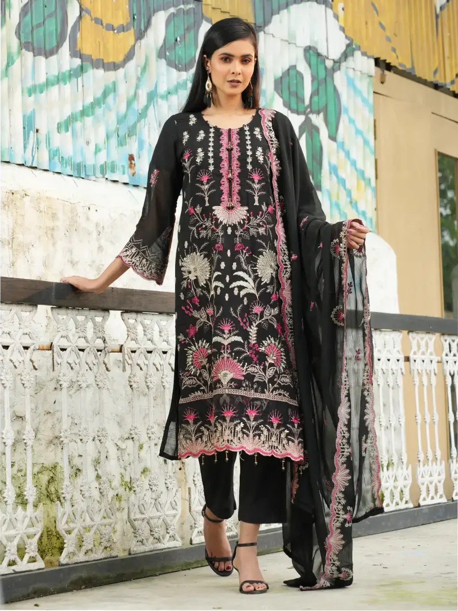 Step into the spotlight with this ethereal Jet Black kurta set, exquisitely designed for festive evenings and celebrations. Crafted in a rich organza silk blend, the kurta features detailed metallic embroidery in shades of pink,silver and black, creating a stunning visual texture. The intricate scalloped hemline and embellished neckline add a touch of regal elegance. It comes with matching embroidered pants and a flowing net dupatta with complementary border detailing. This ensemble is a celebration of heritage design fused with modern grace, perfect for weddings, parties, or formal gatherings.