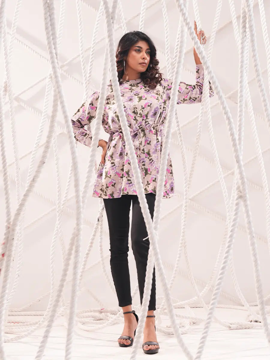 The soft blush base is adorned with delicate lavender and olive floral motifs, creating a romantic and refreshing look. Its round neckline and relaxed 3/4 sleeves balance comfort with polish, while the adjustable side tie cinches the waist for a flattering, figure-enhancing fit. Whether paired with skinny jeans, tailored trousers, or a midi skirt, this top transitions seamlessly from casual daytime styling to an evening-ready ensemble.