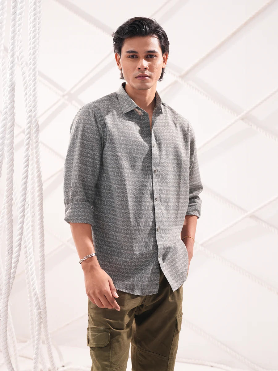 Elevate your casual wardrobe with this stylish grey printed shirt. Crafted from 100% cotton, it offers breathability and a soft hand feel enhanced by a garment-wash treatment for extra comfort. The subtle all-over geometric print adds a modern twist to a timeless classic. Designed with a button-down front, long sleeves, and a relaxed fit, this shirt transitions seamlessly from casual Fridays to weekend outings. Pair it with chinos or jeans for a smart yet easygoing look.