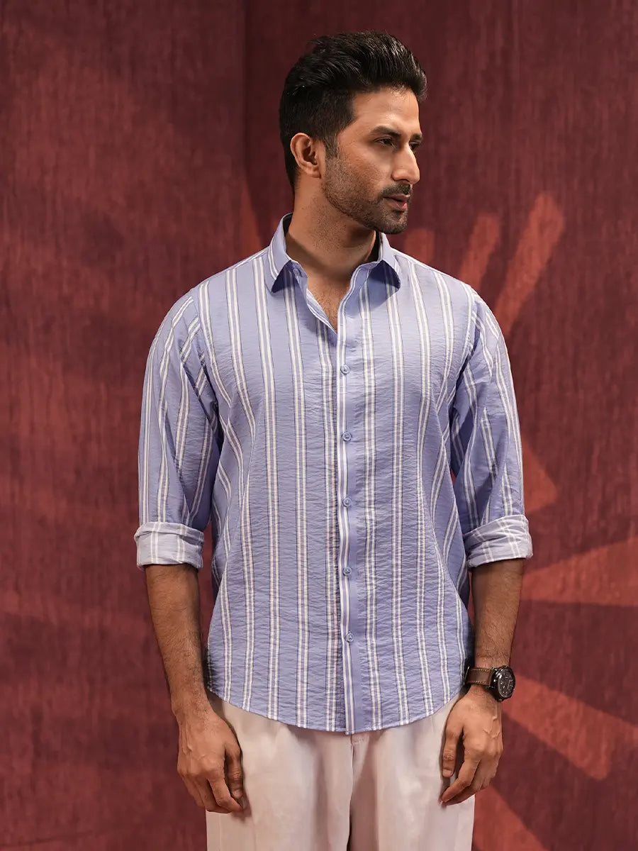 Introducing our Men's Sky Blue Striped Casual Shirt, a must-have for men who value both style and comfort. Crafted from 100% premium cotton, this shirt is soft, breathable, and perfect for all-day wear. Its vertical white stripe pattern on a soothing sky blue base adds a touch of freshness, making it ideal for casual outings, summer gatherings, or semi-formal events. With a regular fit, full sleeves (that can be rolled up for a laid-back look), and a button-down front, this versatile piece pairs effortlessly with chinos, jeans, or shorts.
