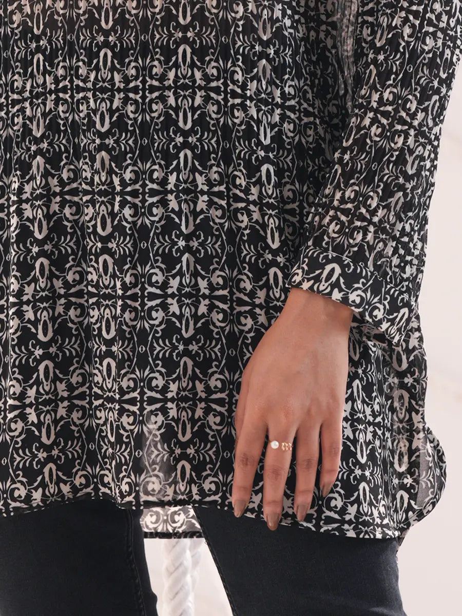 Elevate your casual wardrobe with the Mystic Vine Printed Tunic Top, designed for women who love comfort blended with understated elegance. Crafted from soft and breathable rayon fabric, this top drapes beautifully on the body, making it an ideal choice for both relaxed outings and smart-casual occasions.The intricate off-white vine-inspired print on a rich black base adds a timeless charm, while the three-quarter sleeves and slightly flared hem create a flattering silhouette for all body types. Pair it with jeans, leggings, or tailored trousers for a versatile and polished look that transitions effortlessly from day to evening.