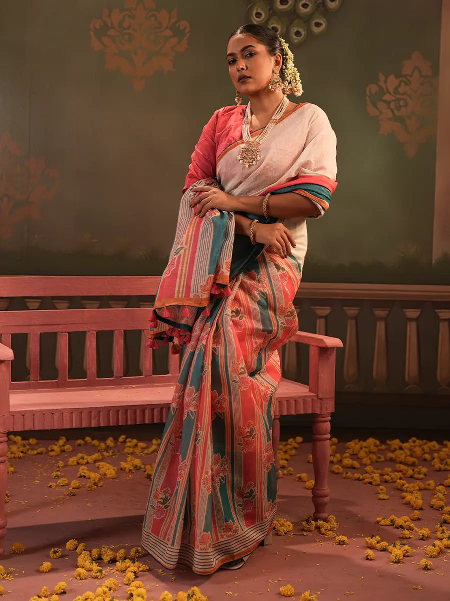 Delicate yet impactful, this blush coral half-silk saree brings together the charm of tradition and the freshness of contemporary aesthetics. Featuring vibrant digital floral prints in coral, teal, and green hues, it captures the essence of heritage craft with modern flair. The saree is further adorned with handmade tarsal accents and subtle glass embellishments that sparkle in soft lighting. Whether you're attending a festive celebration or a daytime event, this saree offers effortless grace with its light texture and elegant drape. It includes a coordinated digital printed blouse piece to complete the look.